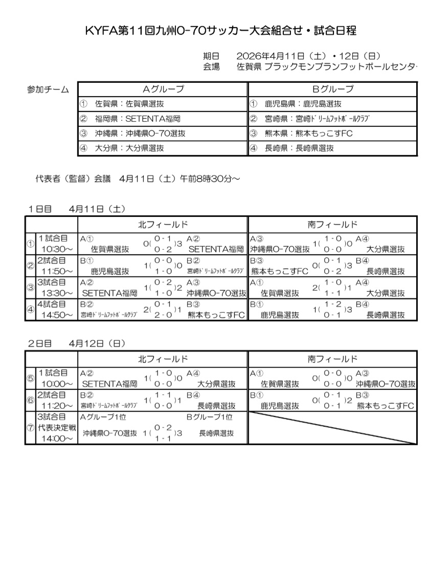 【大会結果】KYFA第11回九州O-70サッカー大会2026-04-14